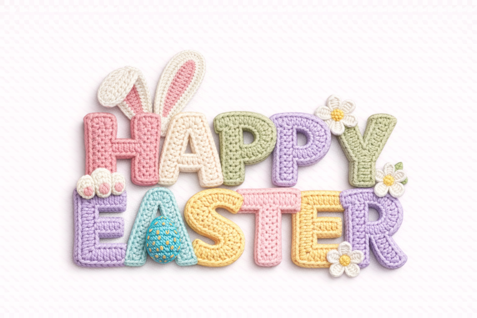 A cheerful “HAPPY EASTER” text design in soft pastel colors, featuring a cozy plush/knitted lettering effect with cute seasonal details—bunny ears, tiny daisies, and an Easter egg accent. Perfect for spring and Easter products like t-shirts, tote bags, mugs, stickers, greeting cards, posters, and wall art.