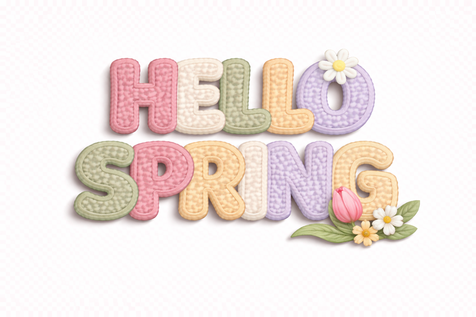 A bright and cozy “HELLO SPRING” text design in soft pastel colors, featuring a cute plush/knitted lettering effect with sweet floral details (daisy + tulip). Perfect for seasonal products and spring gifts—ideal for t-shirts, tote bags, mugs, stickers, greeting cards, posters, and wall art.