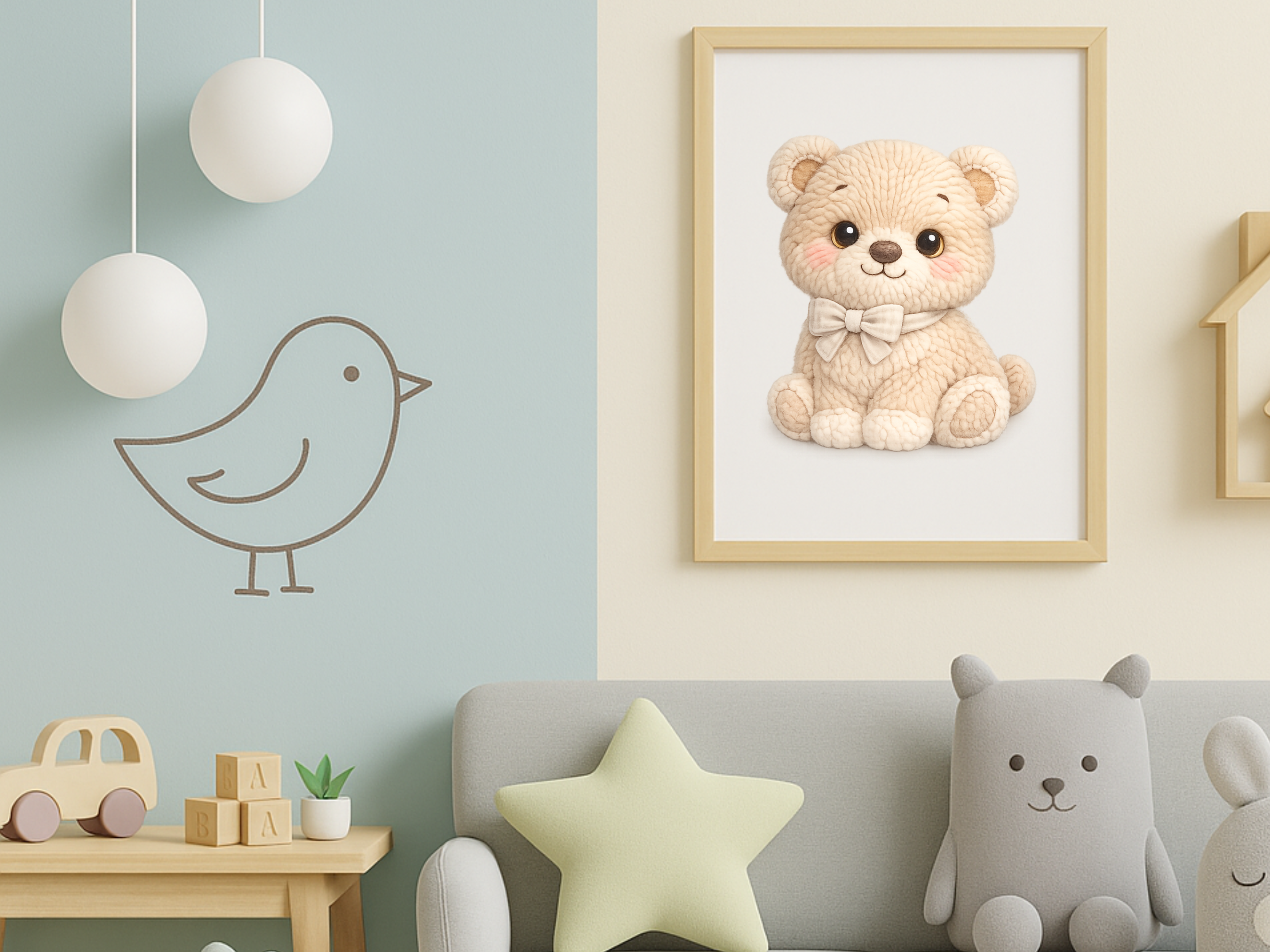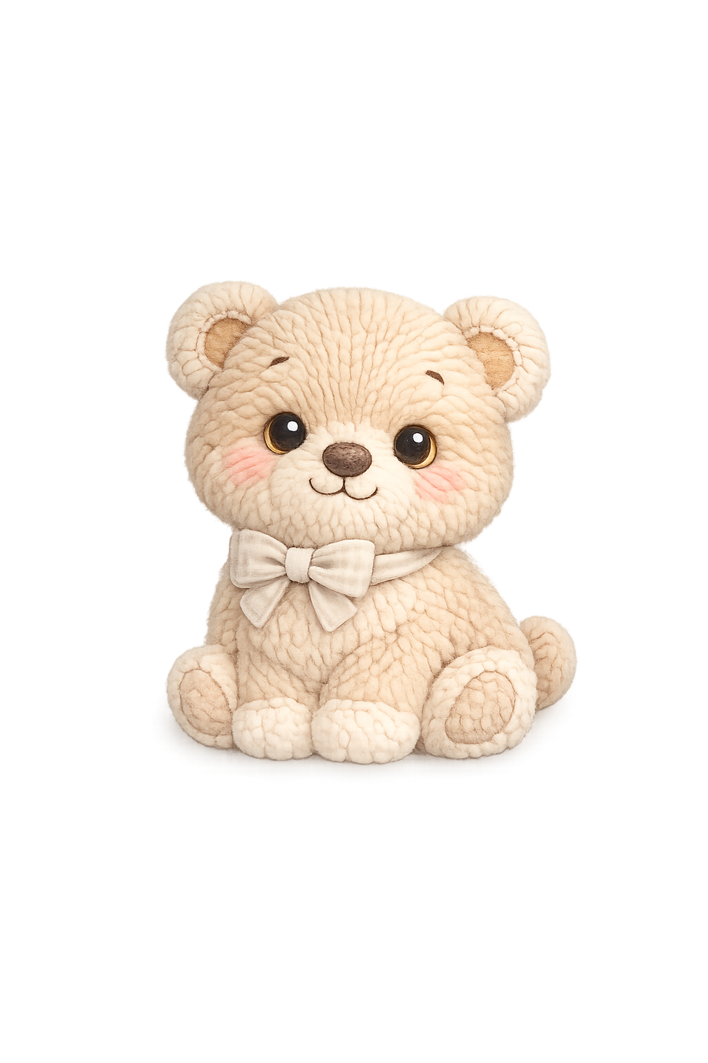 Adorable plush-style teddy bear illustration with a soft, cozy texture and gentle neutral tones, finished with a cute bow. Perfect for stickers, invitations, cards, baby shower printables, nursery projects, and other kids’ design bundles. The framed image is only a mockup to show how the design can look on a product.