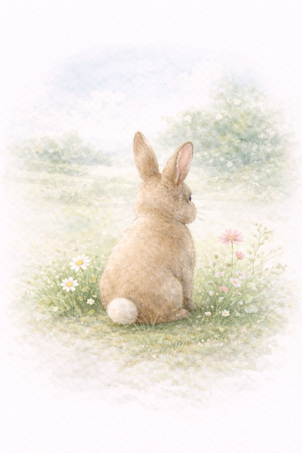 Soft, dreamy watercolor illustration of a bunny sitting in a spring meadow with delicate flowers and an airy, pastel background. Perfect for Easter designs, cards, invitations, nursery projects, scrapbook pages, seasonal prints, and gentle spring-themed bundles.
